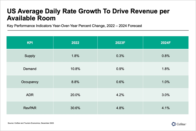 The long-term average for supply growth is 2.1%, but the 2024 forecast is 0.8%, Freitag said. Room rate growth of 4.2% this year and 3% next year are basically at the current level of inflation. That means revenue per available room is expected to grow 4.8% this year and 4% in 2024, a “good conservative measure” given Oxford Economics forecasting zero GDP growth in the first two quarters of next year, he said.